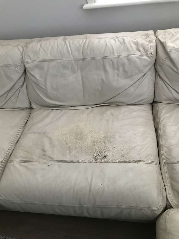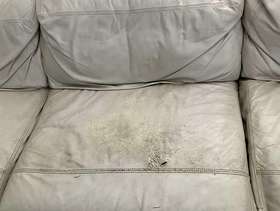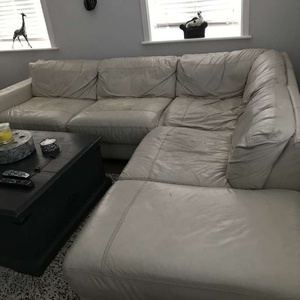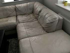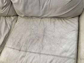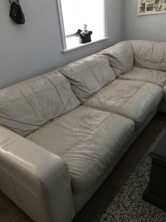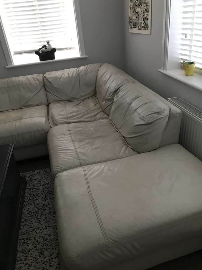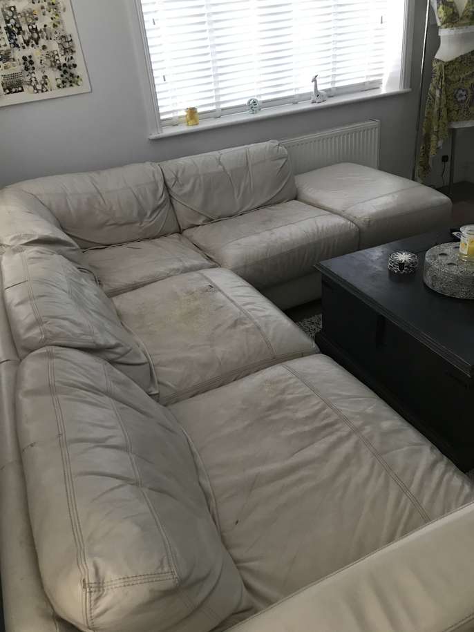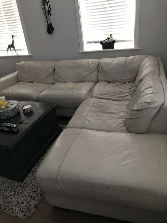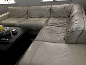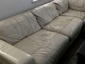Large cream leather sofa. Some seats quite worn, one with a small tear. See photo for measurements. Free to the person that can arrange quick collection from Haslemere.