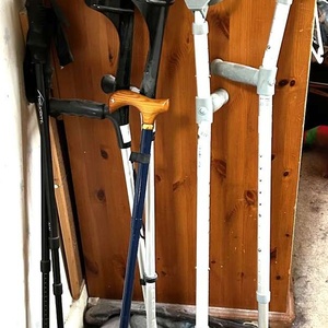 Two pairs of crutches, one walking stick, one pair of walking poles.
