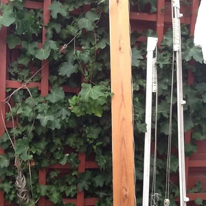 Two curtain rails with right hand pulleys, one 2m length and the other, 1.75cm length. Two matching length pelmet boards with fixing brackets and Velcro front edges.