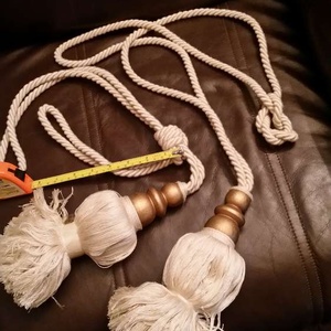 Good quality tiebacks, unfoutunatly one was undone by visiting children. These are new. Someone may be able to work out how to tie up again, if not there is 6' of cord to each tieback and a very nice Gold tassel to each tieback. Collection from Widmore Road area asap , and if you change your mind please let me know.