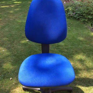 Adjustable desk chair on castors. Blue fabric upholstery.