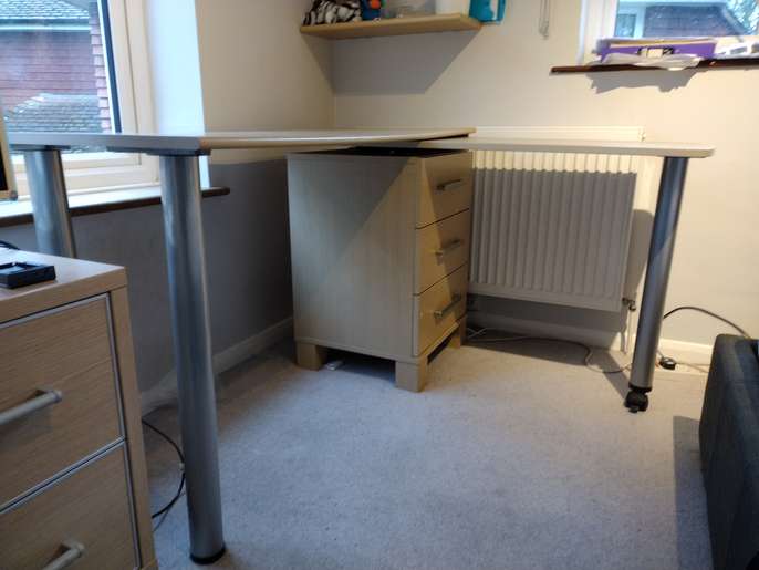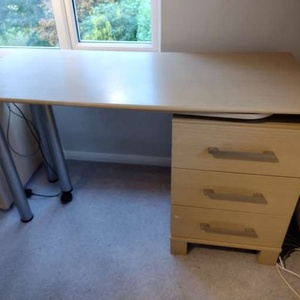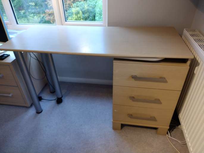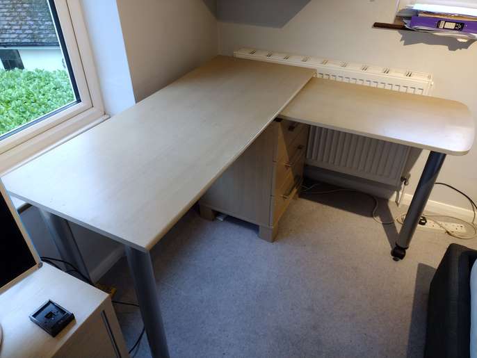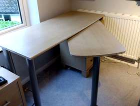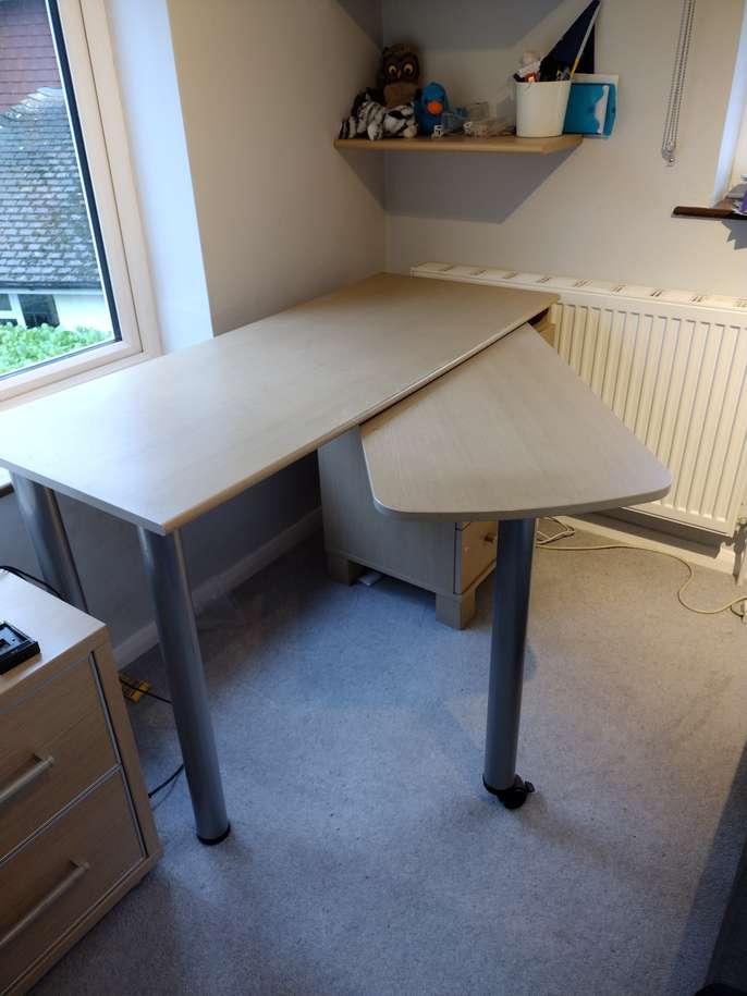 Desk in ash/light oak colour. Solid construction with 3 drawers and a swivel section to create more workspace. The desk has been well used but is still in good working order with just a few marks. 130 cm wide by 55 cm deep extending to 123 cm deep if the side section is used.