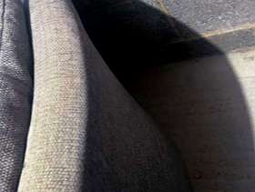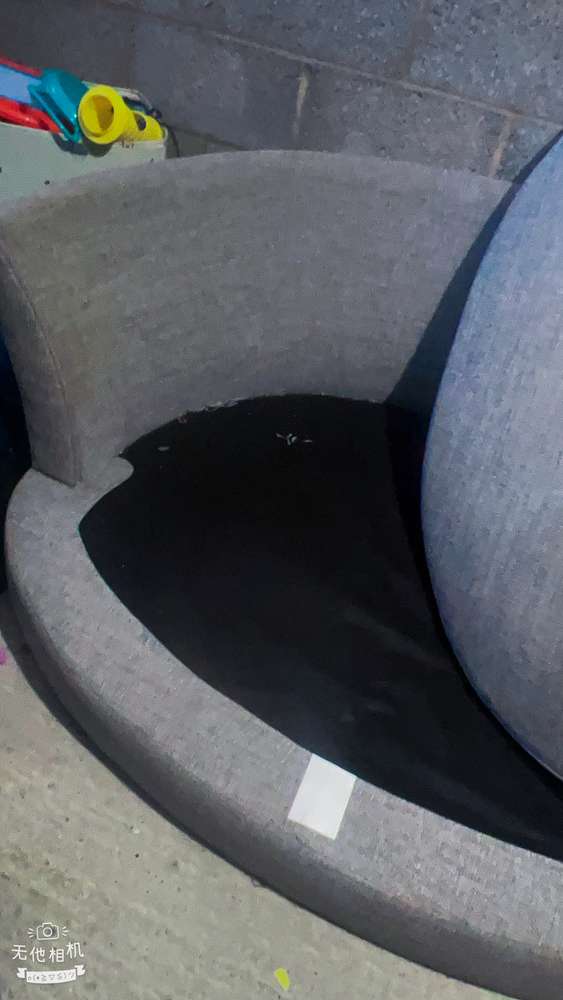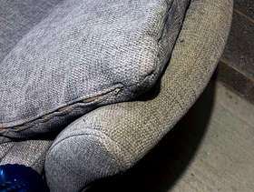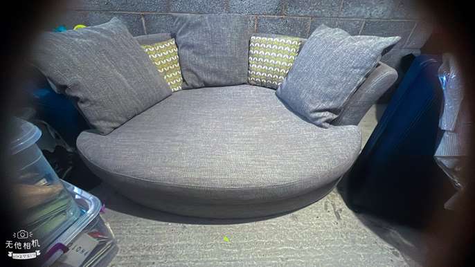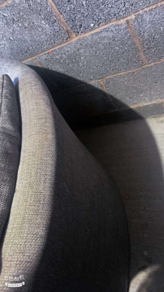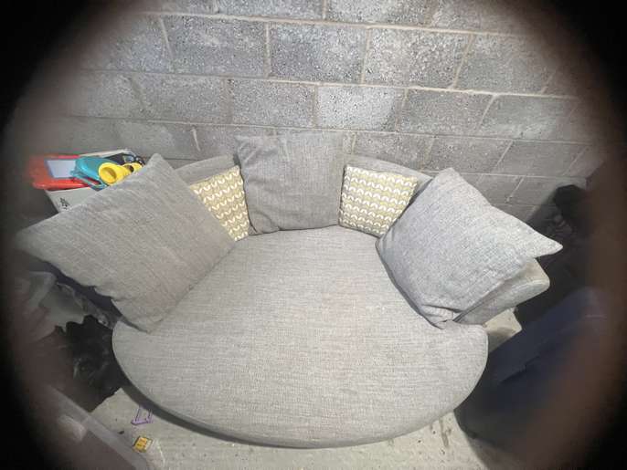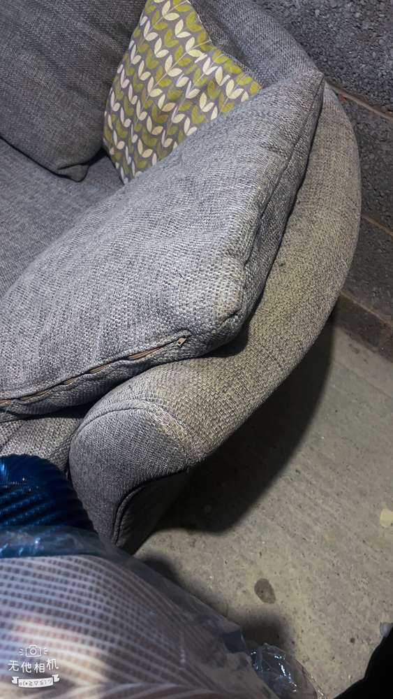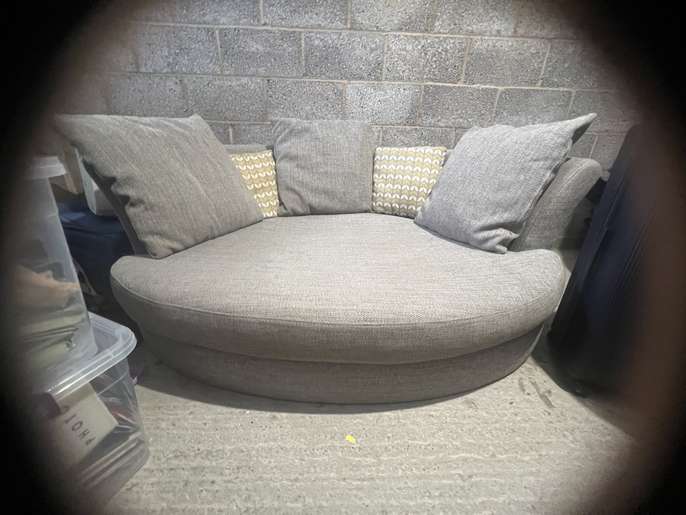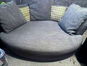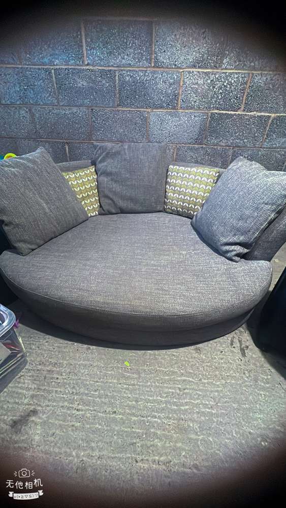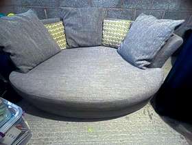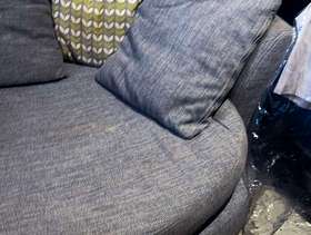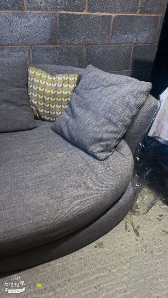 Grey DFS bay -style sofa with 5 - throw pillows. Has fire safety label and is immediately ready for use once it is cleaned. Not damaged or ripped. Available for pick up from today.