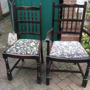 6 dark oak dining chairs - 2 carver chairs, 4 without arms