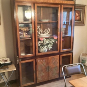 Lovely, Asian style breakfront with stenciled florals on the doors. Top has 4 glass doors and shelves with lights. Bottom has 2 door, shelved space in center and 1 small glass door and shelf on each side.
