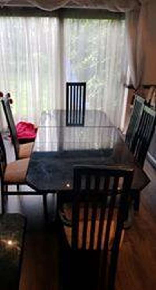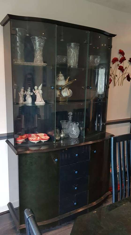 Table six chairs and two units that light up plus coffee table.. Black/Navy marble effect in good condition Offers accepted must pick up in Whitefield Plus matching tv unit too