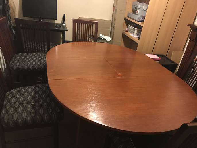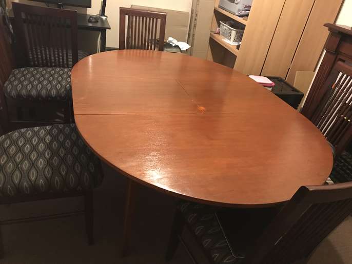 Moving house, so this table and chairs is too big for our dining space. Need a new home for it. Recently upholstered the chairs. Good condition. Must go by this Friday 12/01/18