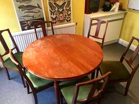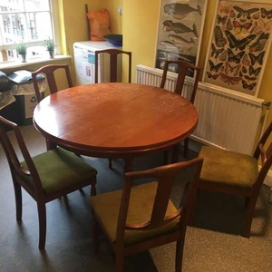 One large solid-wood circular table with 6 upholstered chairs, all in good condition. Must be willing to collect all objects from the third floor of our building, must all be taken together.