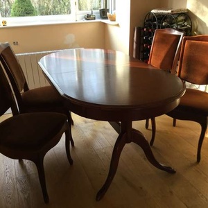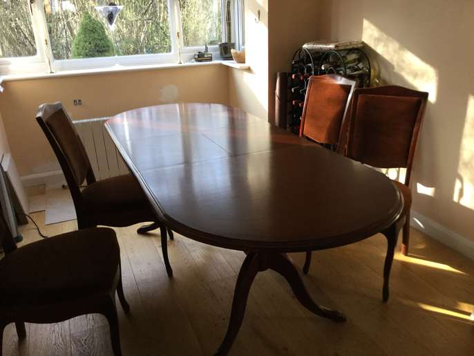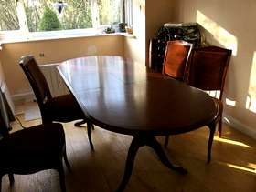 Mahogany dining room table and 4 chairs, table 90cm wide x 170cm long without extension, 220cm long with extension, good condition, collect from Calne ASAP.