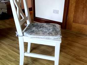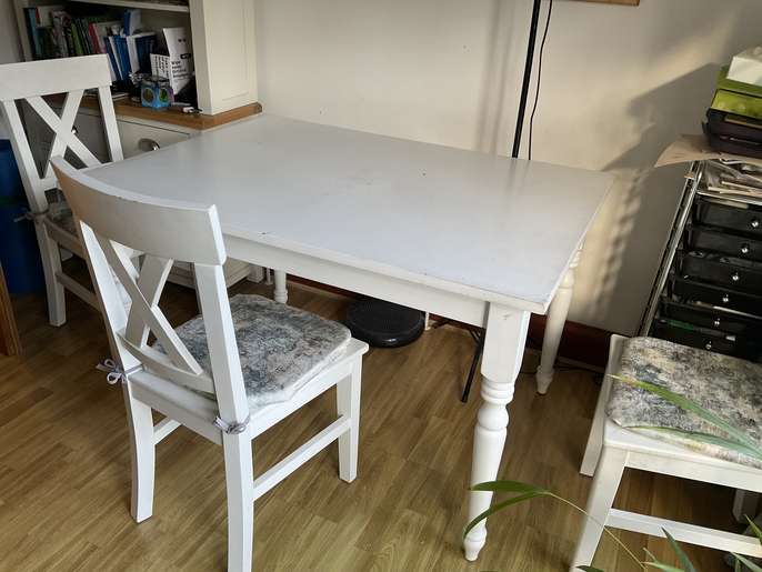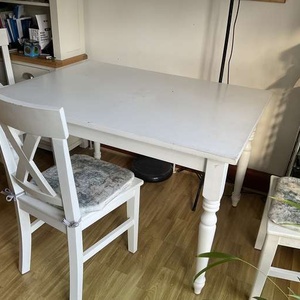 White dining table and two chairs Table 3’x4’x30”h. Slight blistering in centre. Two white chairs to match. Table does not come apart!