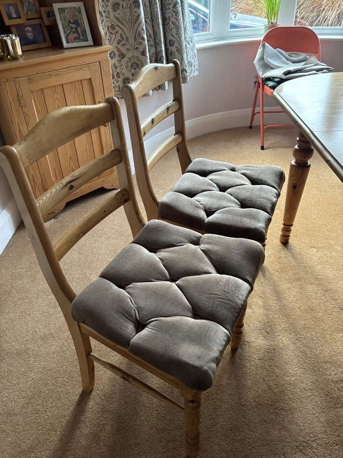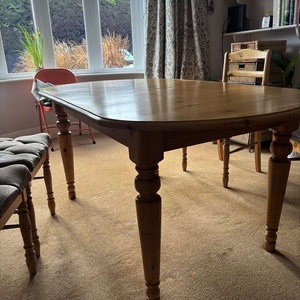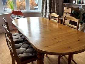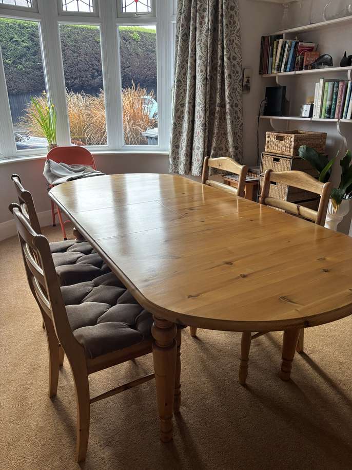 Pine table 152x90cm extending to 190x90 4 matching chairs with seat pads. All in reasonable condition