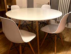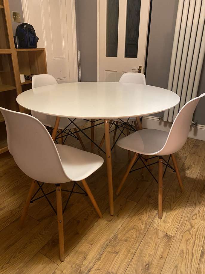 1 white dining table 120cm wide. Top has a few scratches / marks. 4 matching chairs. A couple of them are damaged and will need gluing/ fixing, but can still be used if you are careful. Must be collected ASAP. Northwich area