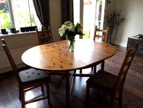 Extendable dining table (as seen in pictures), and 4 dining chairs from Ikea. When extended table is oval and sits 6 people easily, or take the leaf out and it's round and sits 4 people happily. Free, collection only. Table comes to pieces, chairs don't.