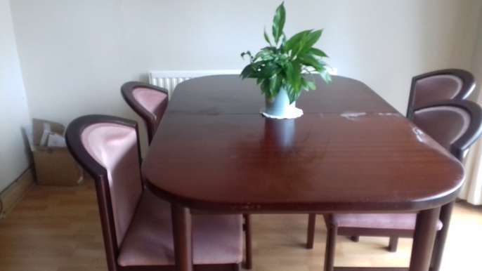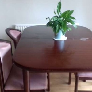 Rosewood dining table and 4 chairs. there is a mark on the table as shown on the photo. The chairs are upholstered and I do not have a fire safety certificate for them