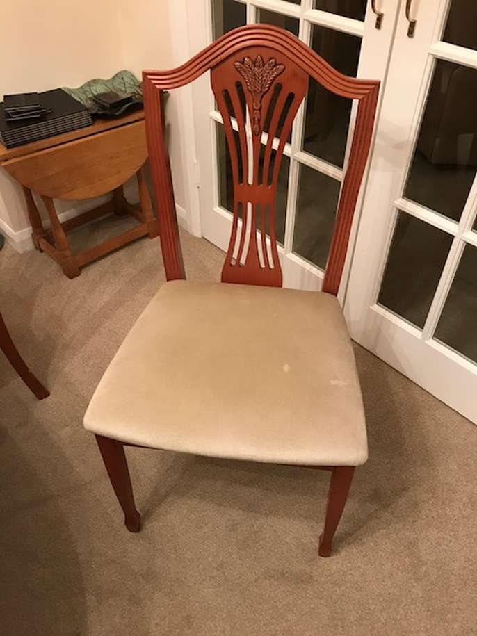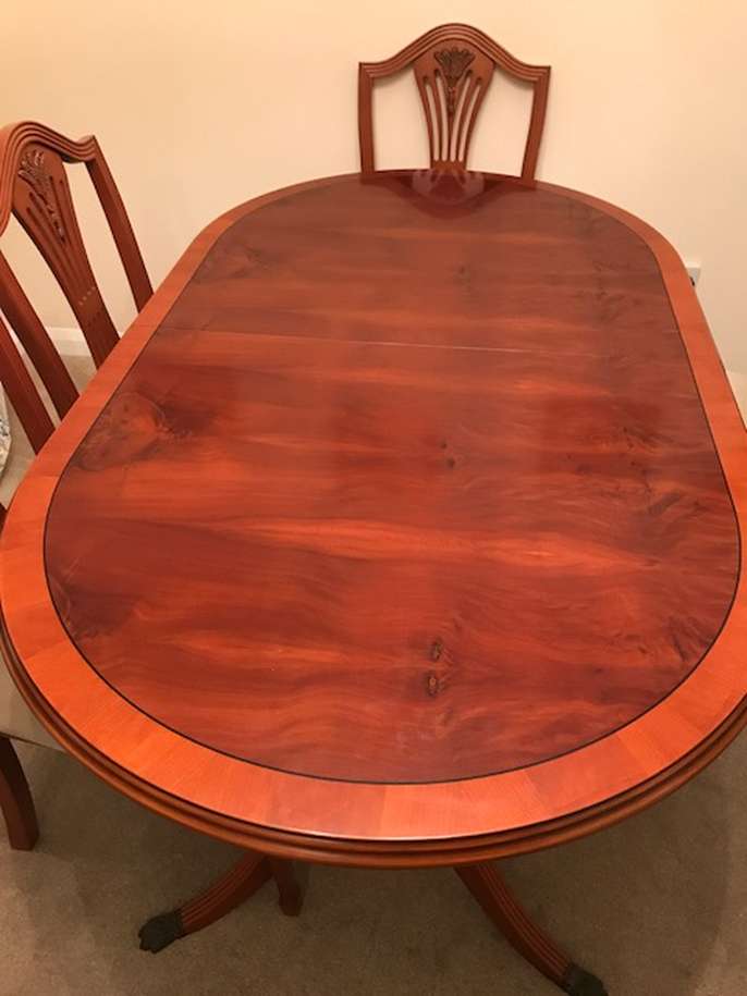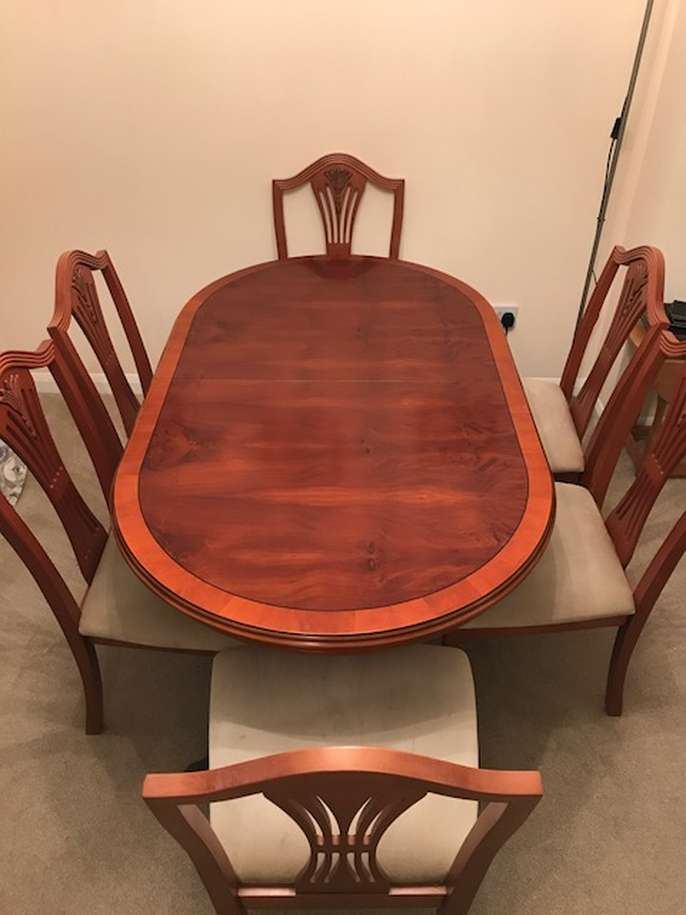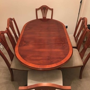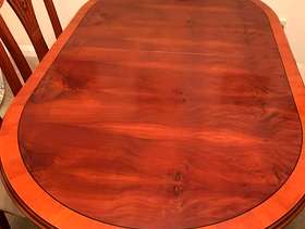 Beautiful antique cherrywood(?) table (58" x 34") and 6 chairs. Will extend to seat 8 people. Very heavy.