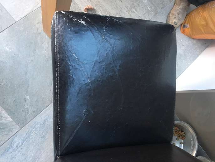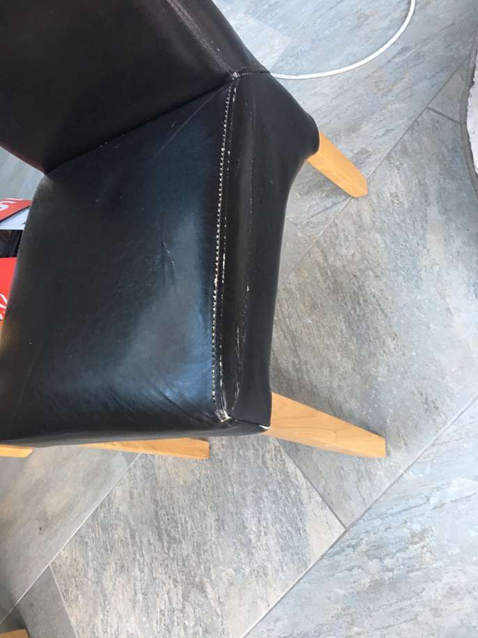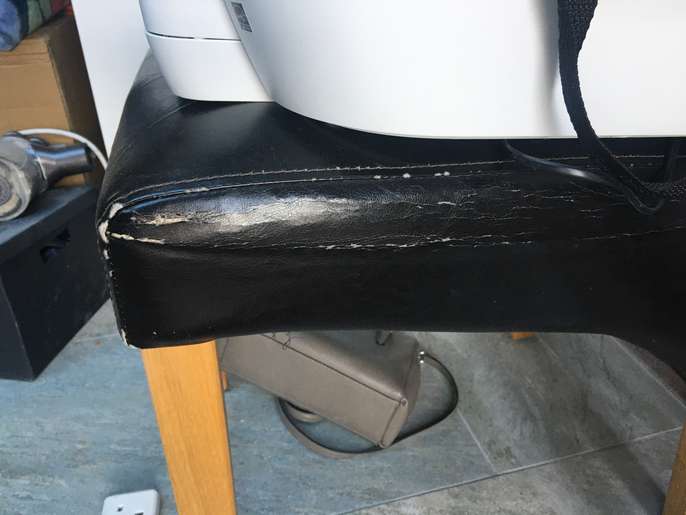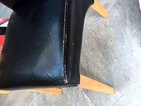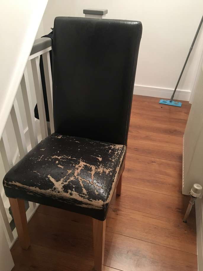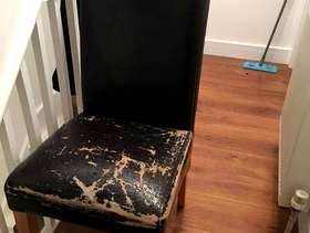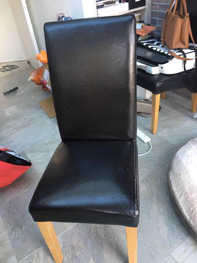 6 strong sturdy dining table chairs Faux leather The covers are worn and the chairs will need reupholstering. A great project for the person with the know how