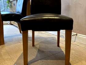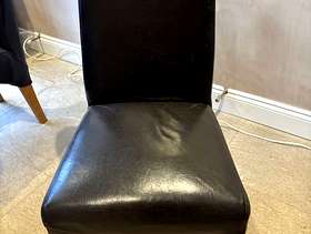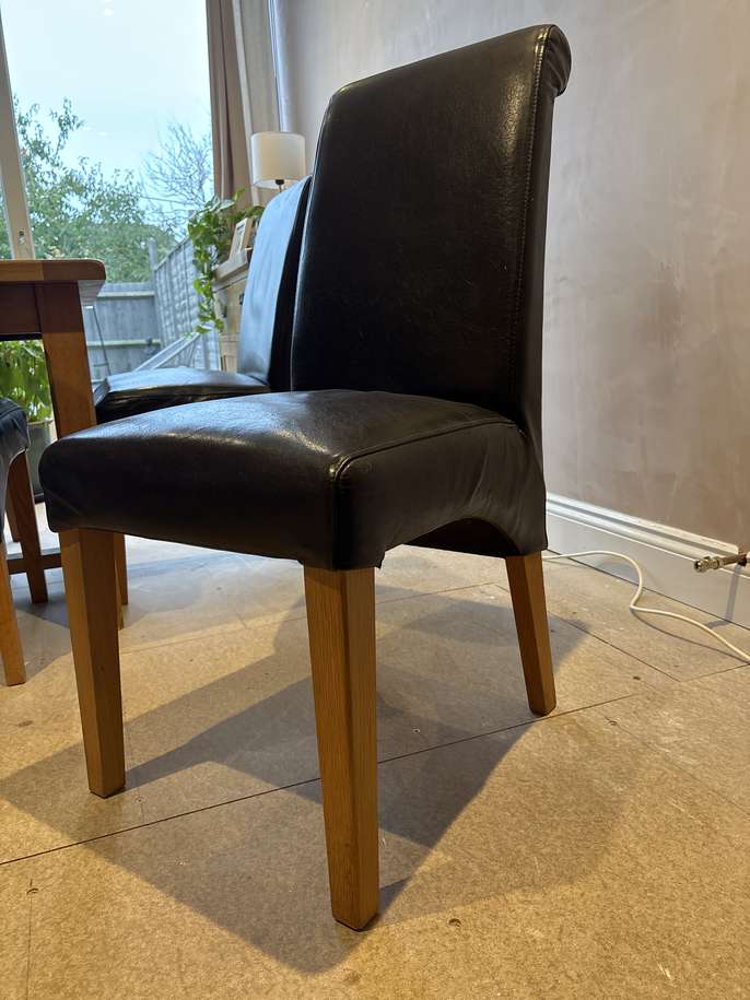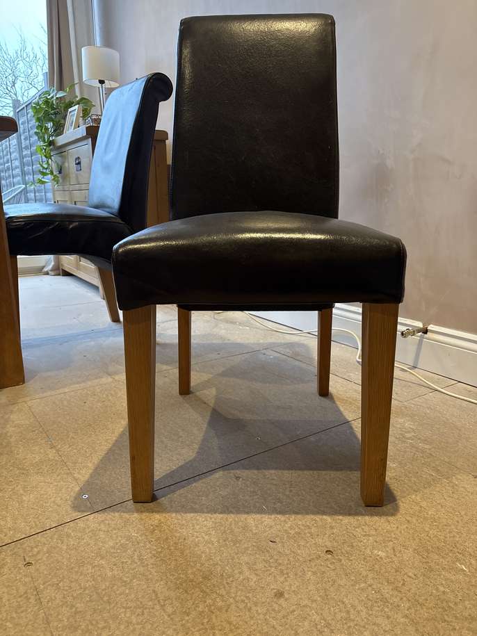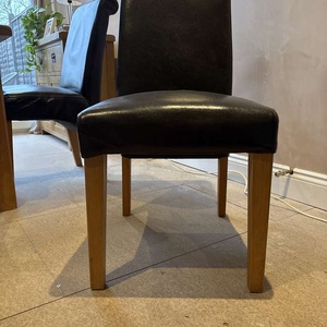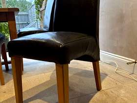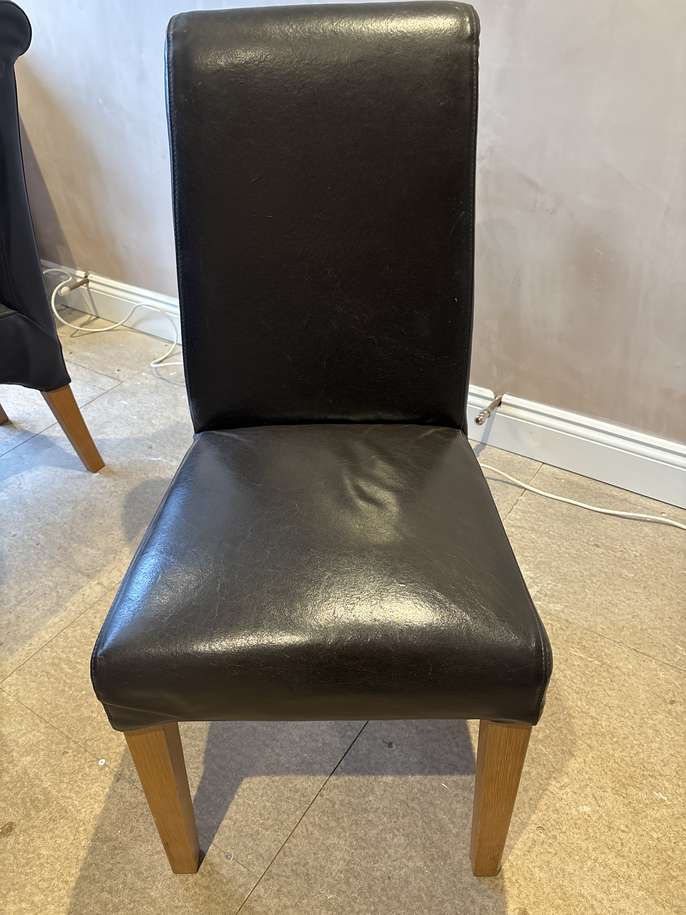 X 8 dinning chairs brown leather seats and oak legs 4 need slight repairs 4 are in a reasonable condition