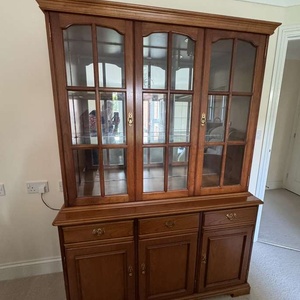 Dresser with three cupboards with 3 drawers in bottom unit and a top unit with glass fronted display cupboards with internal lights