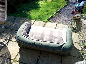 Luxury extra large dog bed by George Barclay, has orthopaedic memory foam padding and the cover zips open so it can be washed - as has just been done! Purchased in error really as our Labrador has not grown big enough to warrant this massive intrusion into our living space so he makes do with an (my) armchair..... cost around £140 two years ago but not used much so giving a free to a good home - although Biff (the Labrador) would I'm sure, appreciate a token of gratitude in the form of snax maybe.... Size is 1200cm wide x 80 cm deep and 32 cm high.