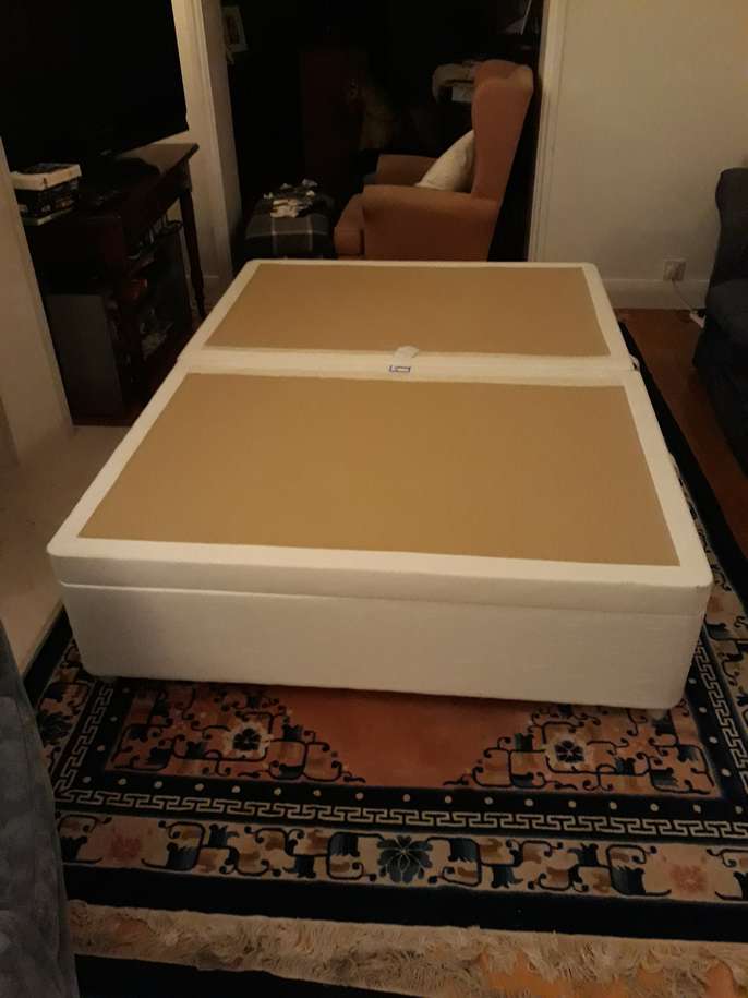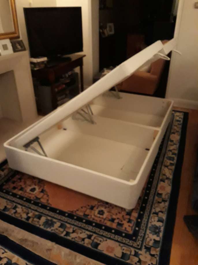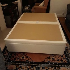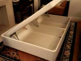 Full storage compartments under, lift style total storage weight 60 Kg . Good condition - only used for spare room. Cream sides to base. Unused head board attachment kit. Base comes in two sections so easy to move/ position, casters to base. Size 135 cm wide x 190 cm length. To be collected.