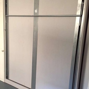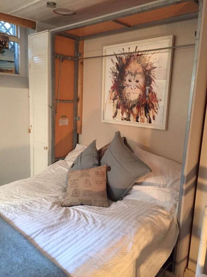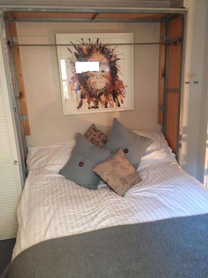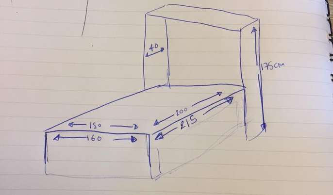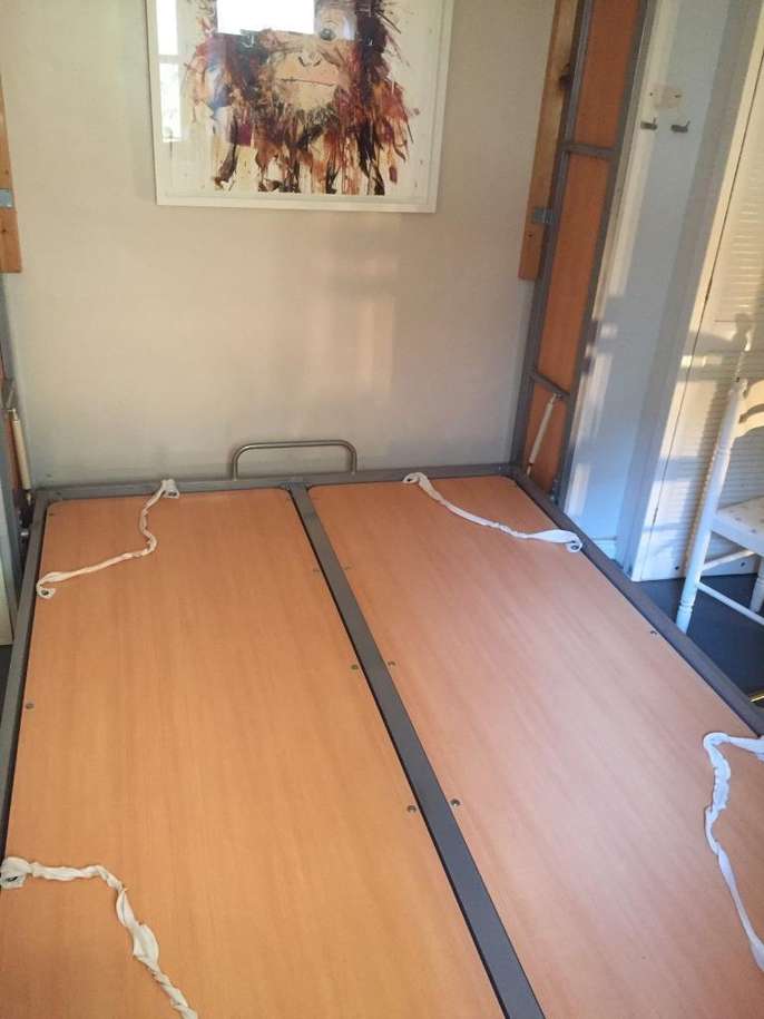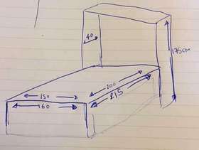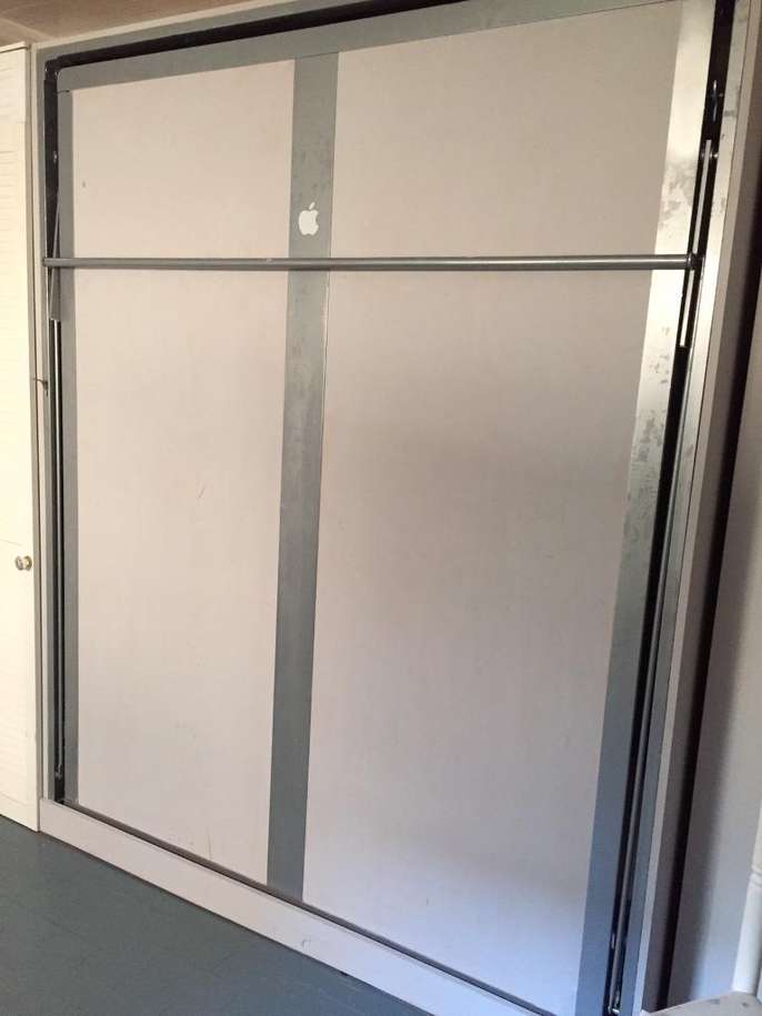 Space Saver! Double bed with mattress. Pull down bed. Dimensions set out in photo attached. A great bed, very comfortable, offering for free as changing the look of the room and need the space quickly. All working and will go back together with several screws (all bagged up). Will bolt straight up against a wall. It has been partially painted grey, the bad can be repainted on the wood easily to suit your room. It does have a double mattress so a van would be ideal for pick up.