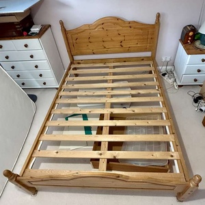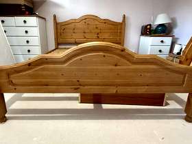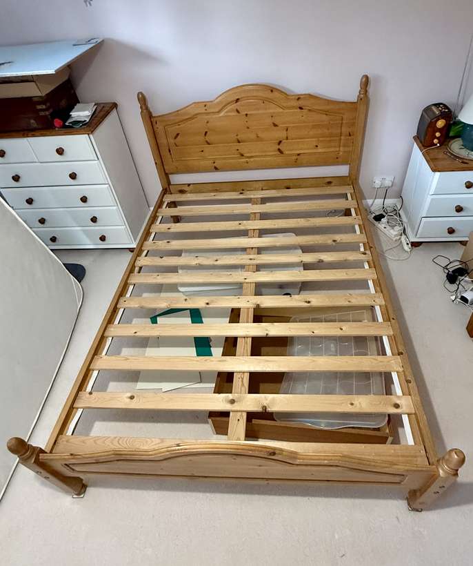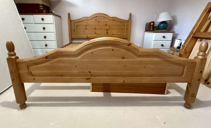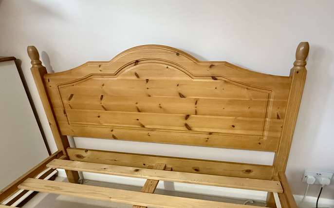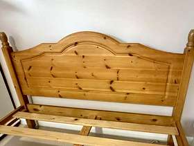 Double pine bed frame The largest piece ( the headboard) is 144 cm x 102 cm Long pieces for the sides are 190 cm long No mattress To be collected No time wasters