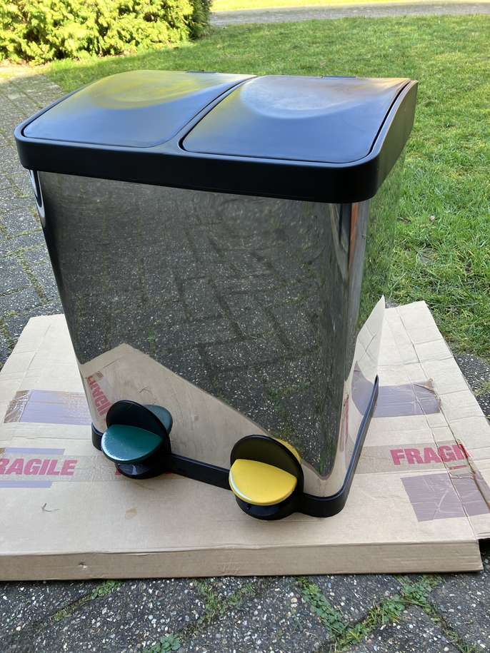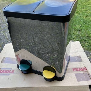 Stainless Steel dual recycling bin 2 removable inner compartments Handle missing on one ! Foot pedal operated Height 46cm x Width 38cm xDepth 30cm Pedals bit worn see photos Free on Collection Heatherside, Camberley