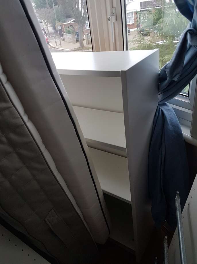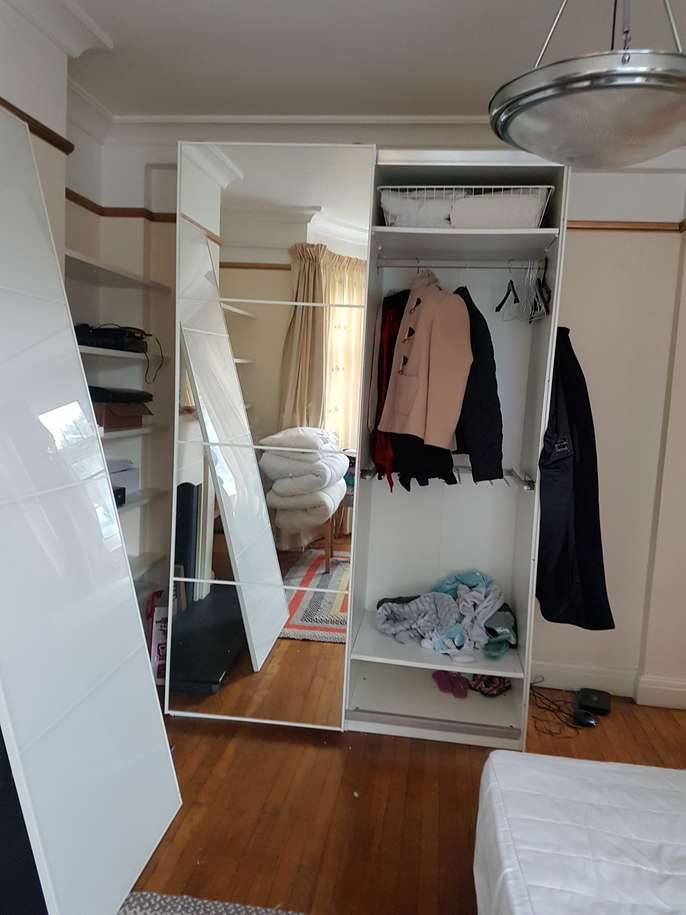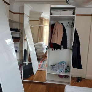 Used Double Wardrobe and 4 bookcase has been disassembled to move house two weeks ago. I have all pieces. Seems reasonable, but maybe had be damage when was transports. Still can buy some pieces from Ikea in case. There is no mirror on the door just glasses. Please contact us to collect.
