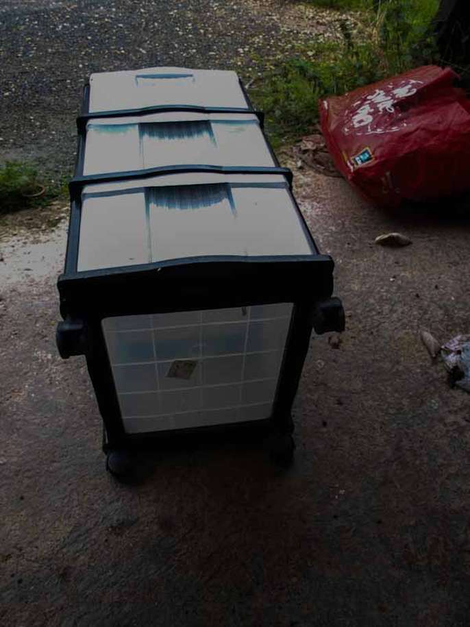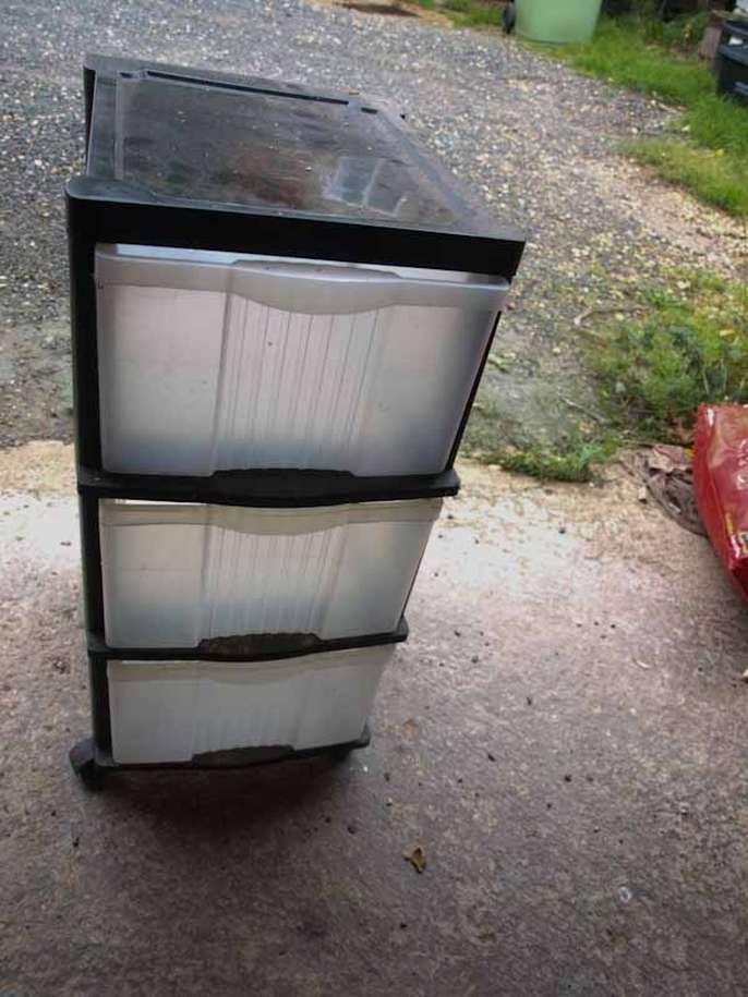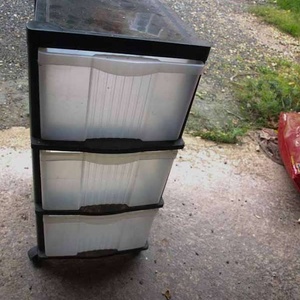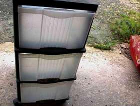 Plastic 3-drawer unit on castors, 680mm high x 410mm deep x 326mm wide (external dimensions);, drawers are 370mm long x 265mm wide x 180mm deep (internal dimensions). Each drawer section can be separated from the others, so you could reduce it to 2 drawers high if you want to... In the pictures the top is on back-to-front! I have now put it back on the right way round. Made by Contico.
