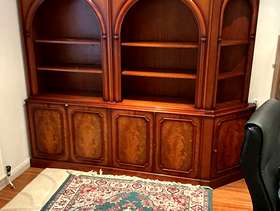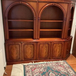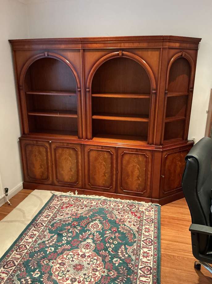 Dark wood dresser with shelves above and cupboards below. It is 7’6” (2.29m) wide, 6’6” (1.98m) high and 1’9” (0.53m) deep. It is in three pieces.