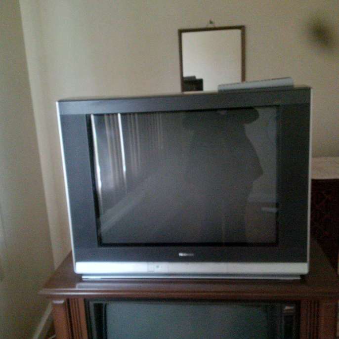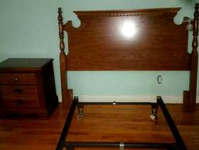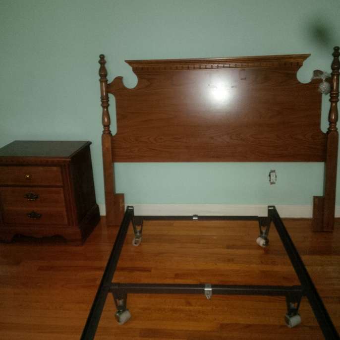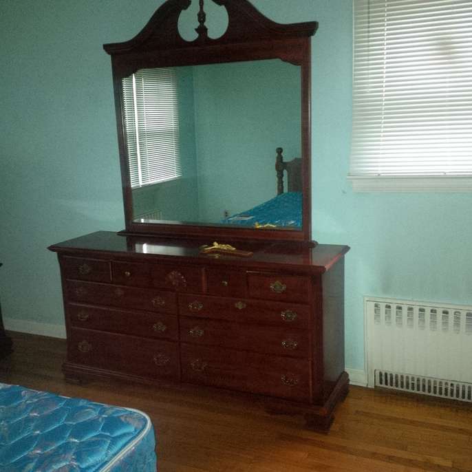 Good condition dresser with mirror 1 full size bed frame 1 full size headboard Old tv TV stand
