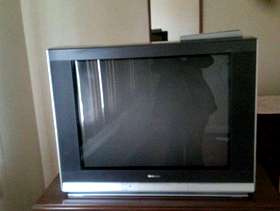 Dresser with mirror, metal bed frame, headboard, old tv and tv stand