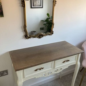 Cream 2 drawer dressing table with wood finish top. Decorative gold frame mirror.