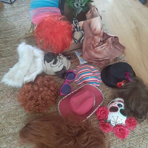 A fun mixture of wigs, big glasses, hats, masks etc, ideal for silly dressing up.