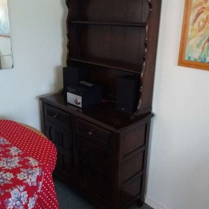 Dark brown Dutch dresser. Rounded top with two shallow shelves with ridges. Bottom part has two drawers and doors under, with one shelf inside. Free to collect. Height 173 cm, Width 93 cm, Depth 48 cm.