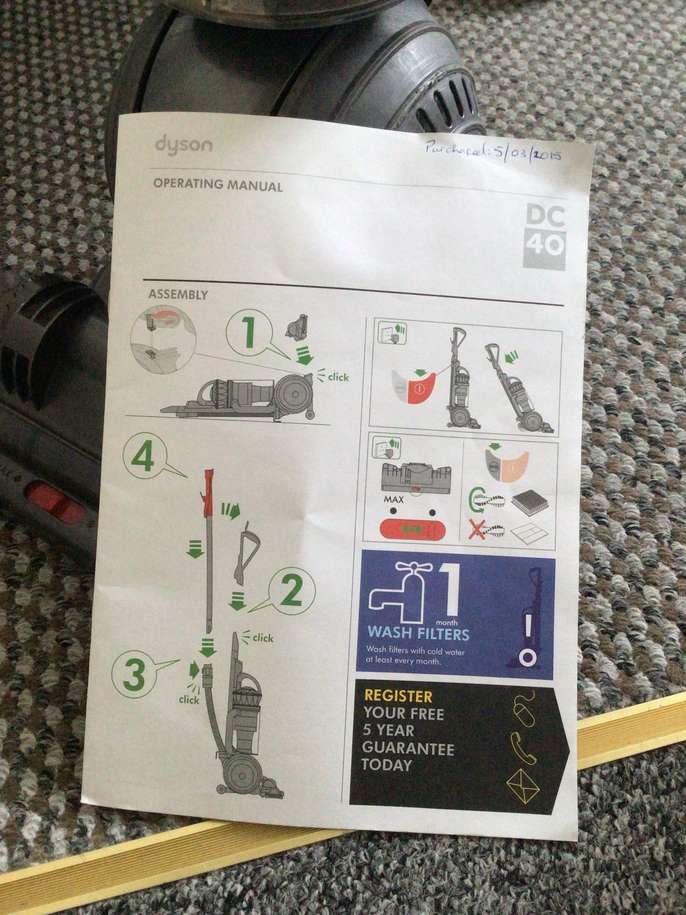 Dyson upright vacuum which has till recently been very useful in a pet free home. Still has some use and is working ok. No longer being used as I have replaced it with newer version.