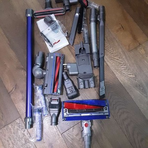 Assortment of V6 tools including:- Hard floor soft roller, carpet/hard floor head, small motorised head for stairs Large and small dusting brush, crevice tool, extendable flexible crevice tool Two spare filters, unused dust bucket Charging point and brush for furnishings with bristles and velvet. Extendable hose, spare V6 pole All washed and dried