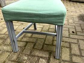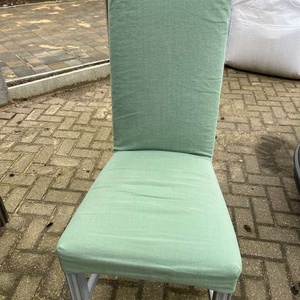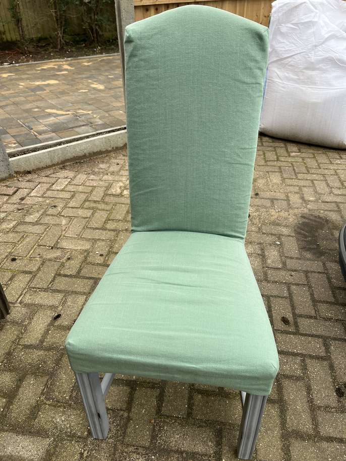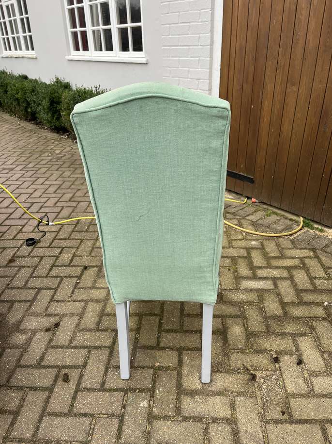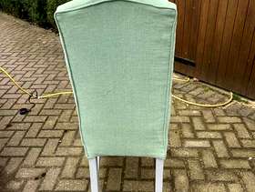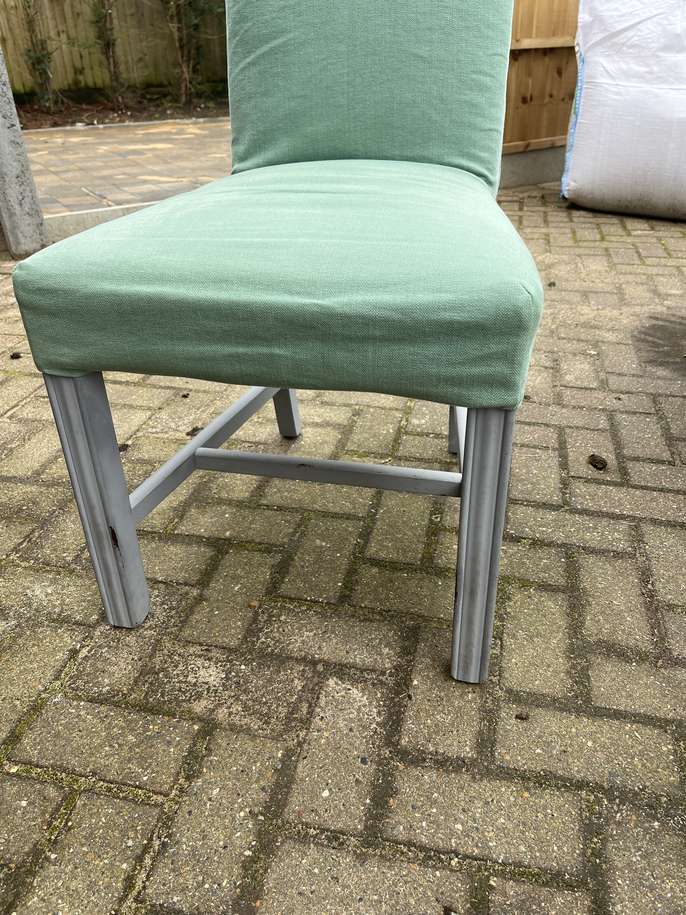 Set of eight comfortable traditional style dining chairs. Loose covers can be removed. Legs painted, originally stained wood, could be restored or repainted
