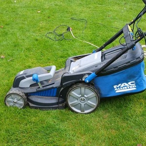 Electric Lawnmower, MacAllister (B&Q ). Now too heavy for me to push along. Working BUT it's very difficult to move the main handle out of its upright position. It can be done, but there's knack which I will demonstrate. I recommend the handle be left down (as per photo). Acquirer will have to pick up from my address.