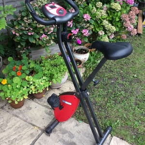 Freestanding exercise bike that folds slightly to take up less room - 8 speeds - adjustable seat height - electrics no longer working so calories time etc can no longer be measured
