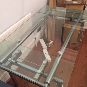 Extendable Glass Dining Table with metal legs. Some tarnishing and rustiness on the legs that could be touched up, the glass top is in beautiful condition. Can be extended very easily. Collection only. Evenings or weekends.