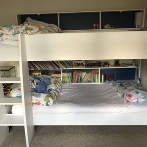 2 year old bunk bed in great condition. Please look at the below link for dimensions https://www.cuckooland.com/brand/kids-avenue/parisot-kids-tam-tam-bunk-bed-with-reversible-colour-shelves?gclid=EAIaIQobChMIsJKMu4uU2QIVhrvtCh1LEAN5EAQYByABEgJeefD_BwE There is some drawing on the ceiling area of the lower bunk but the boarding can simply be flipped over when it is dismantled and put together again. Great book storage area and really sturdy steps. You will need to dismantle it on collection to ensure you know how to put it together again.