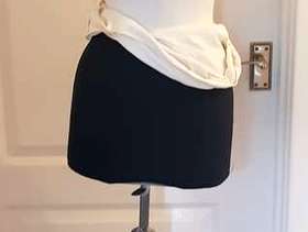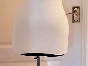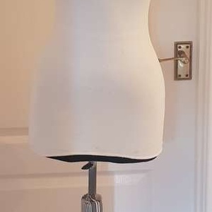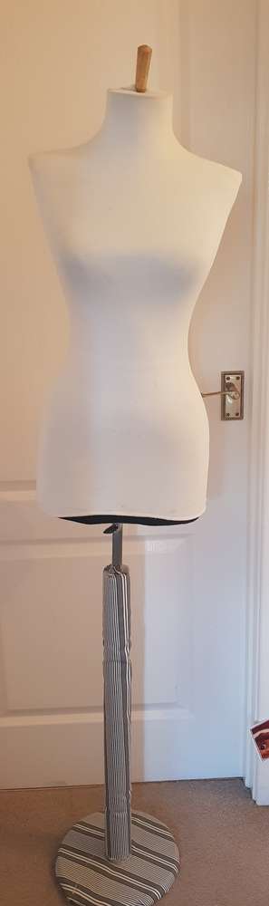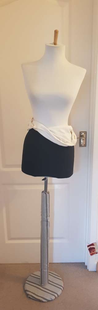 Female manniquin with height adjustible stand. Body is plastic with a black and a white jersey cover. Wooden stand is roughly covered in cotton fabric so could be removed.