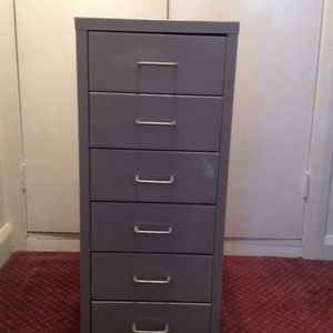 Grey/silver metal filing cabinet on wheels. 6 drawers. Measures H 168cm, W 28cm, D 41cm