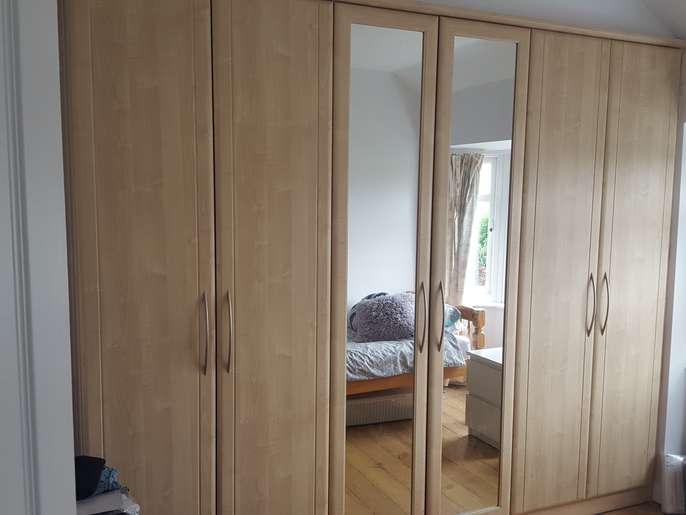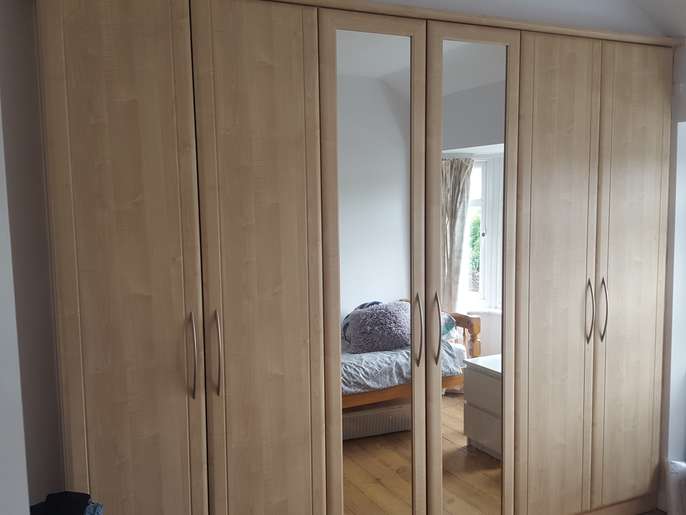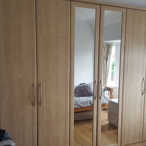 I am removing these wardrobes this week (Wednesday). Hanging space and shelving inside. 2250 high, 550 deep, 2650 wide. Message me if you would like to dismantle yourself so you can see how they fit.