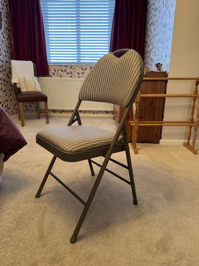 Sturdy Costco folding chair with grey and white padded back and seat and grey metal frame. Perfect condition. Only used once. Collection only please from Great Lumley.