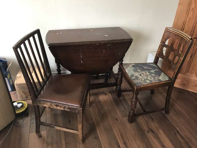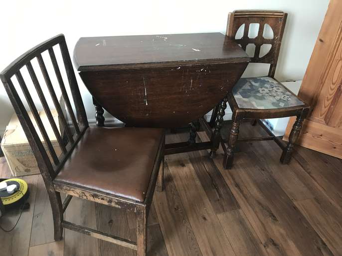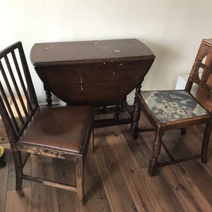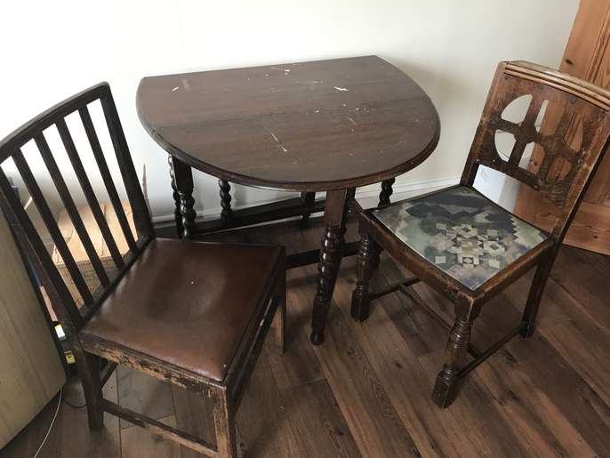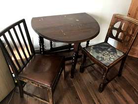 A dark wood folding dining table and two chairs. Has paint marks and a few scratches but other than that a good solid piece of furniture. Pick up only.