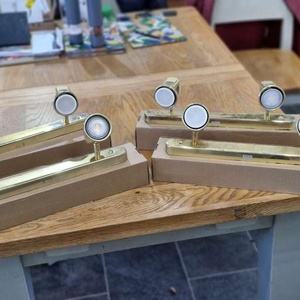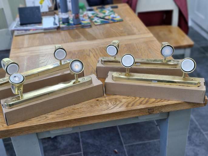 Four brass effect spotlights and bulbs AND three double wall lamps with opaque glass shades