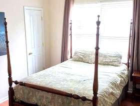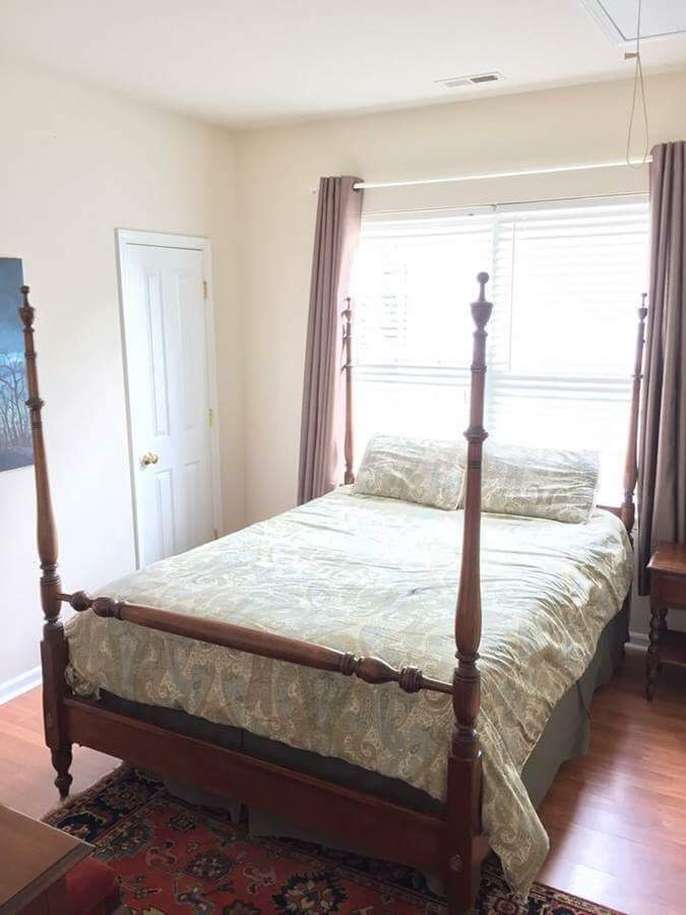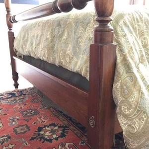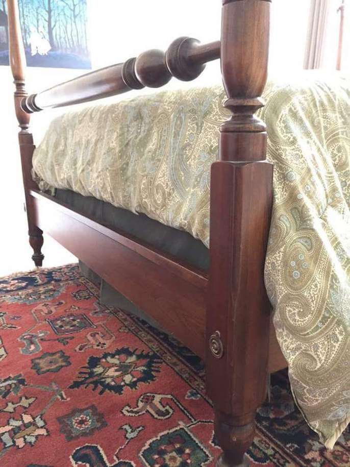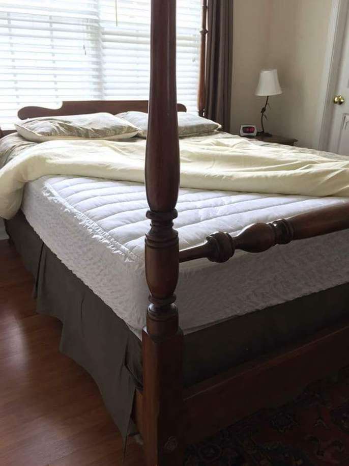 Queen four poster bed, VERY gently used mattress/box spring, comforter, matching decorative pillows, dust ruffle. Semi-firm mattress, very comfortable!