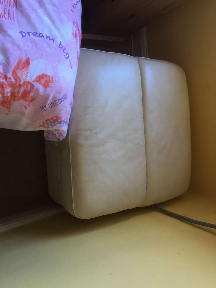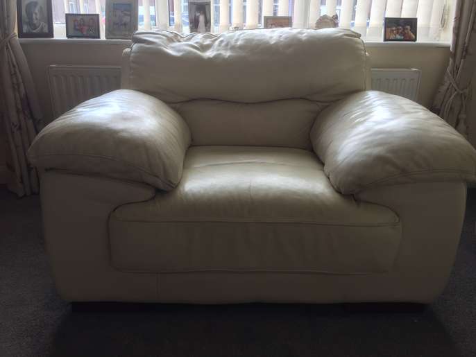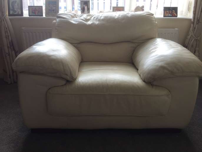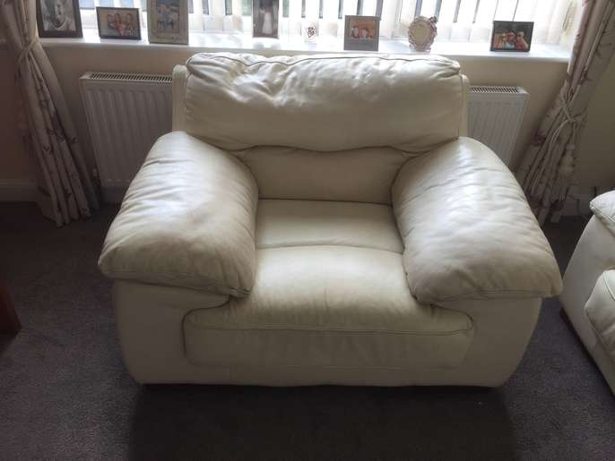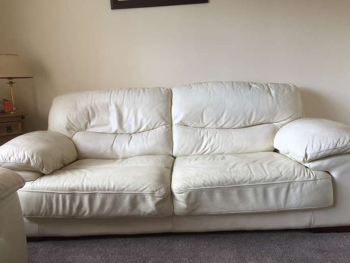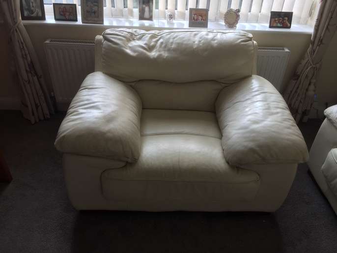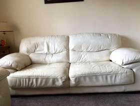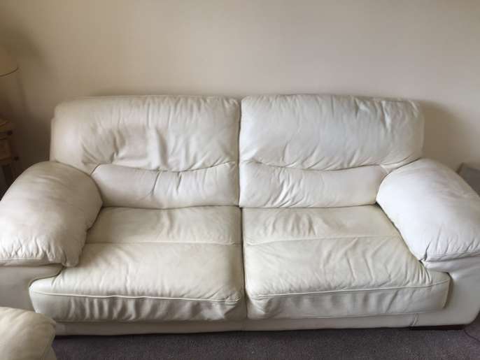 As it says above. Free cream 3 seater setter leather and single cream chair with a footstool that opens up for storage. See pics. Will need to be collected as unable to deliver. From Flixton.